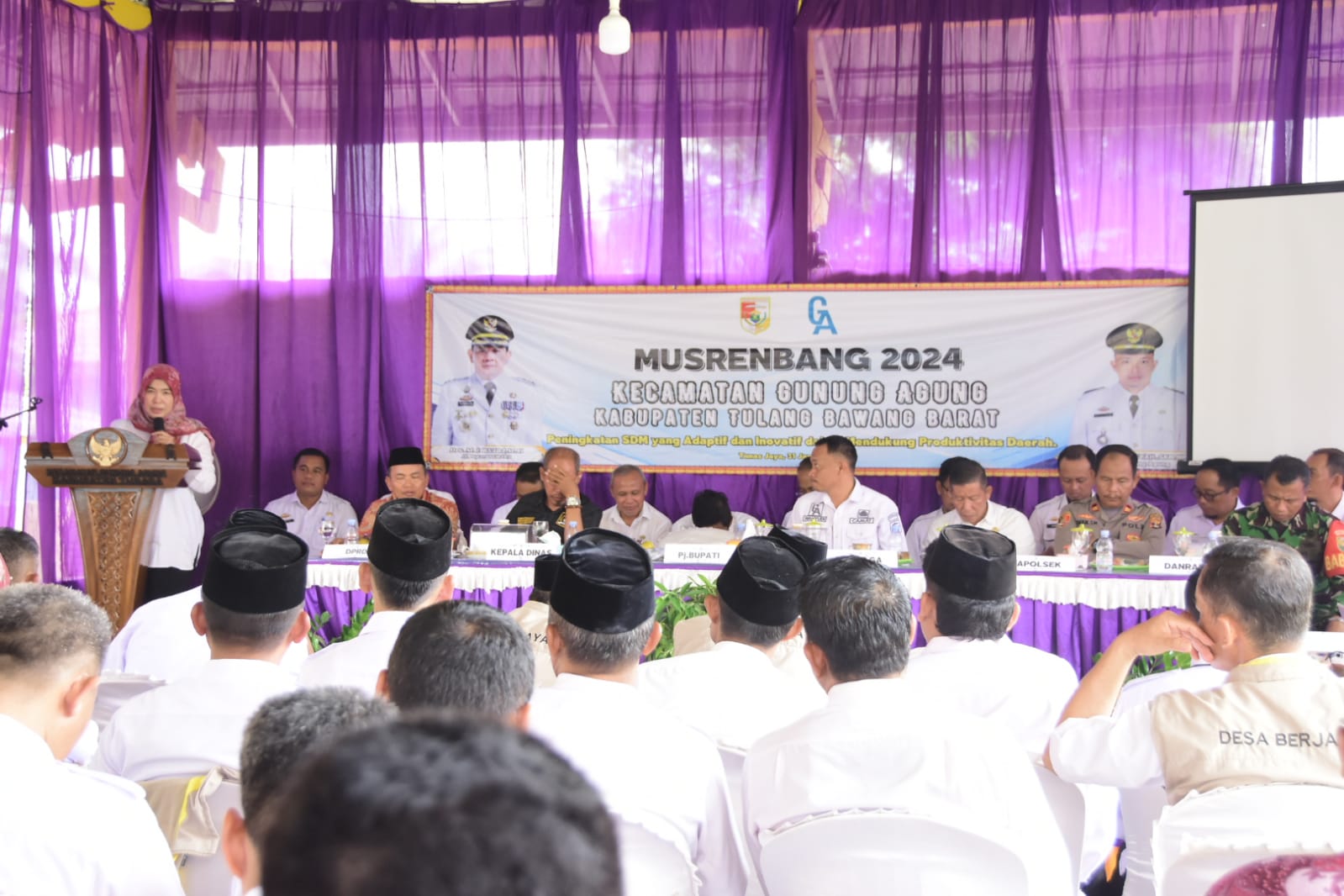 Tulang Bawang Barat, HD- Asisten 1 Bidang Pemerintahan Dan Kesra Tulang Bawang Barat Dra. Bayana. M.,Si Membuka kegiatan Musrenbang dan Rembuk Stunting Tingkat Kecamatan, Di Aula Kantor Kecamatan Gunung Agung. Selasa (31/01/2024)
