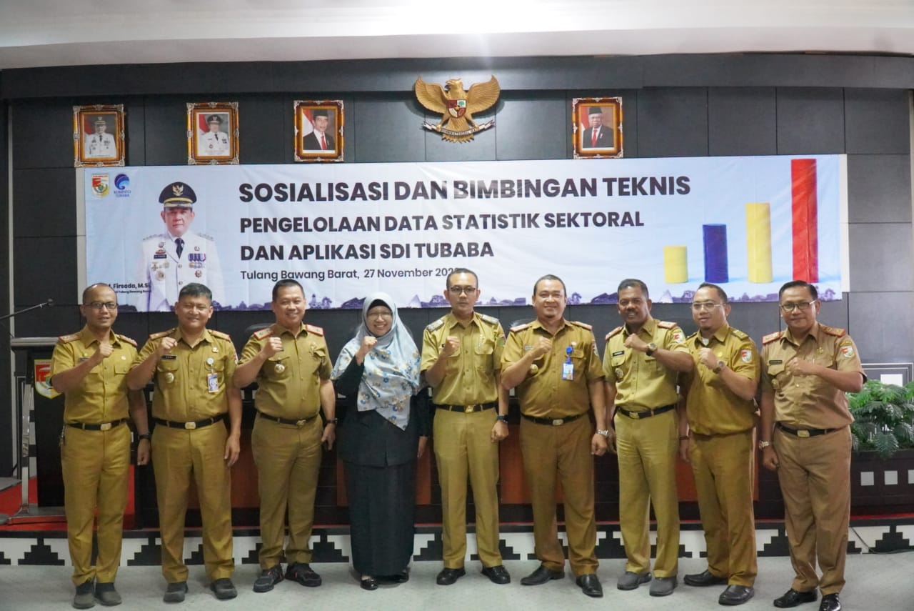 Sosialisasi dan Bimbingan Teknis Pengelola Data Statistik Sektoral dan Aplikasi Satu Data Indonesia (SDI) Tulang Bawang Barat, dihadiri dan diikuti para Asisten dan Staff Ahli, Inspektur Inspektorat Kabupaten Tubaba, Kepala Dinas/Badan/Bagian dan Camat se Tubaba.