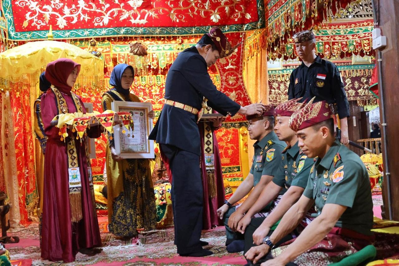 Penganugerahan gelar dan sekaligus pemberian piagam kepada, Letkol Inf Rinto Wijaya, S.A.P., M.I.Pol., M.Han., Letkol Inf Rizki Kurniawan, S.HUB, IN, dan Letkol Armed Roni Hermawan, SH.MM. di Lamban Dalom Kepaksian Pernong Pekon Balak, Kecamatan Batu Brak, Senin 29 Juni 2025 Malam.