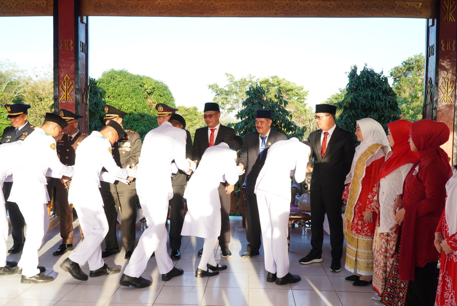 Tulang Bawang Barat, (HD) – Usai melaksanakan tugas penurunan bendera merah putih pada peringatan Hari Ulang Tahun (HUT) ke-80 Republik Indonesia, Bupati Tulang Bawang Barat, Ir. Novriwan Jaya, S.P., bersama Wakil Bupati Nadirsyah serta jajaran Forkopimda menghadiri ramah tamah dengan anggota Paskibraka di Tribun Lapangan Upacara Pemda Tubaba, Minggu sore (17/08/2025).