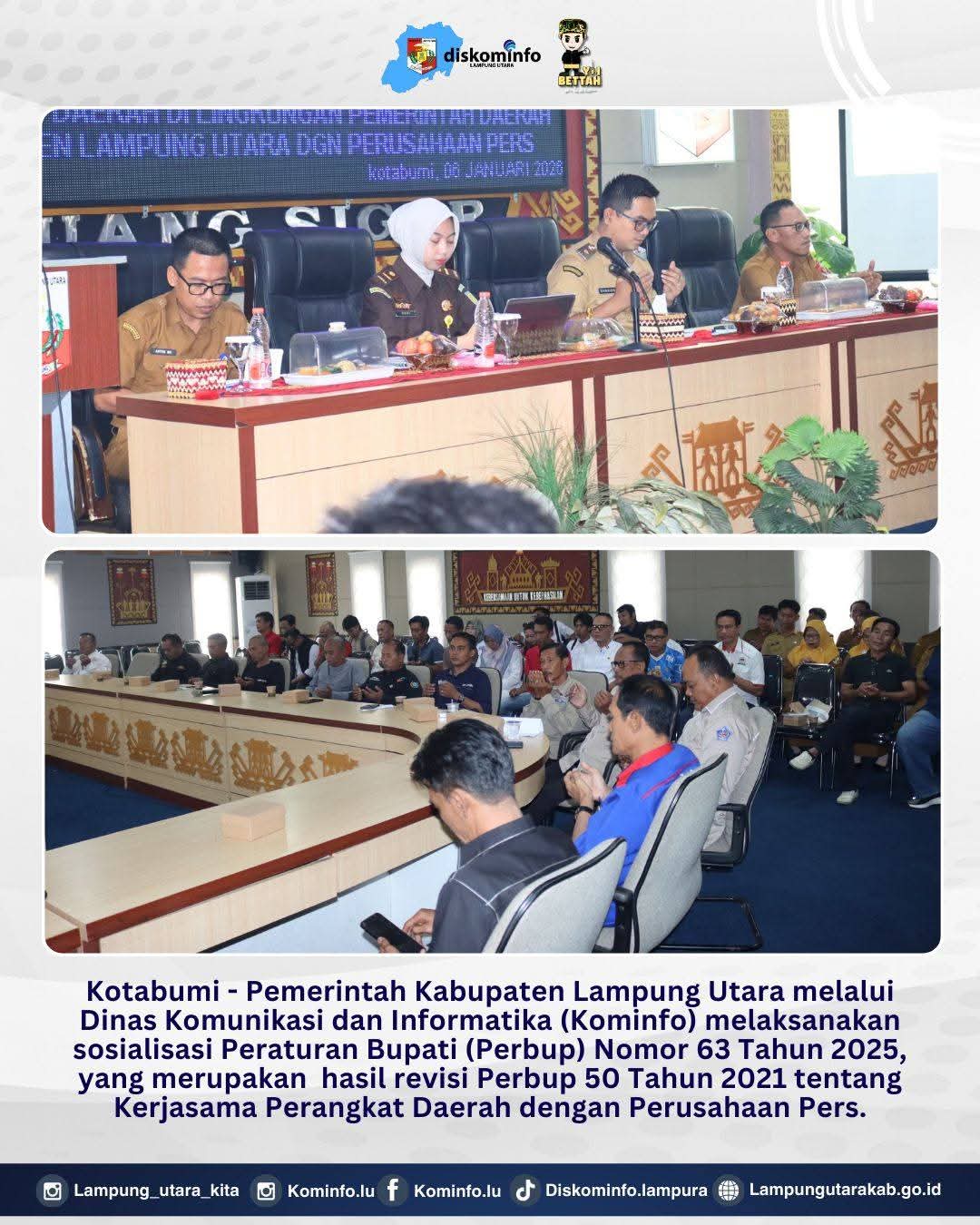 Lampung Utara, (HD) – Pemerintah Kabupaten Lampung Utara melalui Dinas Komunikasi dan Informatika (Kominfo) melaksanakan sosialisasi Peraturan Bupati (Perbup) Nomor 63 Tahun 2025, yang merupakan hasil revisi Perbup 50 Tahun 2021 tentang Kerjasama Perangkat Daerah dengan Perusahaan Pers.