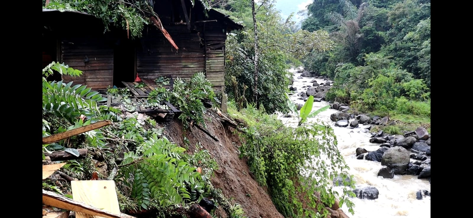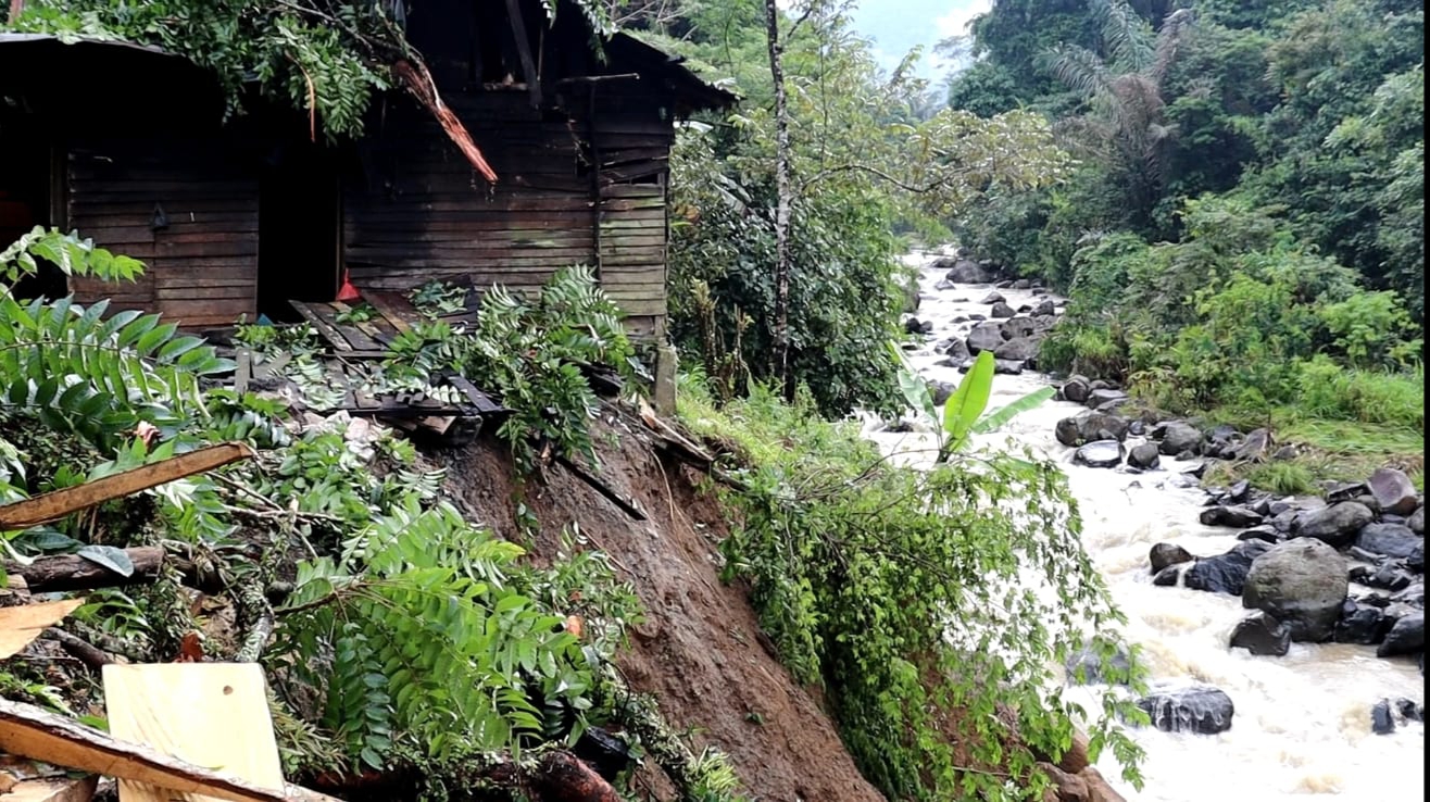 Lampung Barat (HD)– Cuaca ekstrem serta hujan lebat di Kabupaten Lampung Barat mengakibatkan sebuah rumah warga di Pekon Kubu Perahu, Kecamatan Balik Bukit nyaris ambruk terseret arus sungai yang meluap, selain itu hujan deras mengakibatkan tanah longsor dan pohon tumbang.