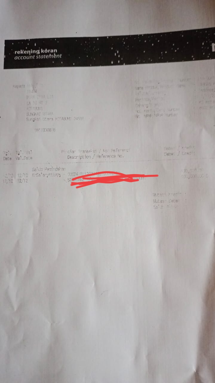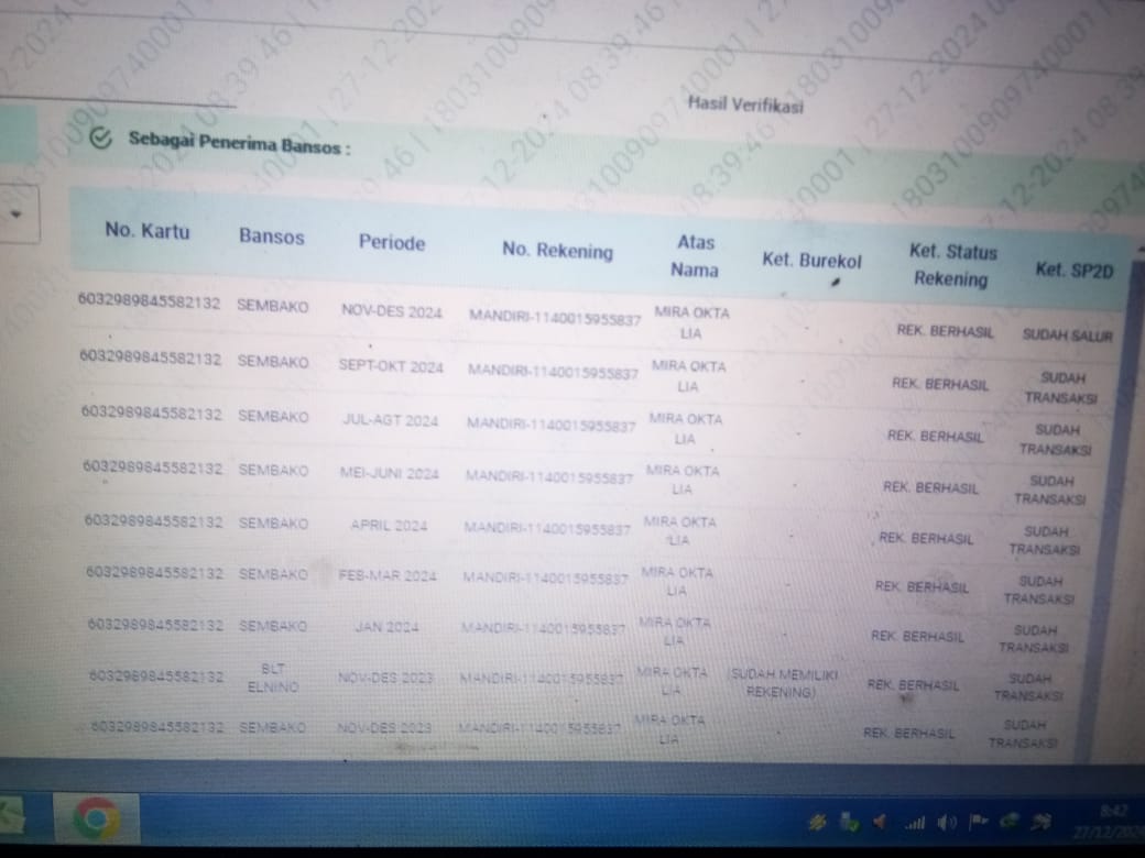 Setelah saya konfirmasi pada pihak bank mandiri, pihak bank mandiri sudah mencetak buku dan rekening sejak 2021, dan uang itu sudah tersalurkan pada KPM, dan pihak bank memperlihatkan melalu rek koran dan terakhir terlihat sudah di tarik melalui brilink tanggal 12 bulan Desember 2024 sebanyak rp.400.000 (empat ratus ribu rupiah).