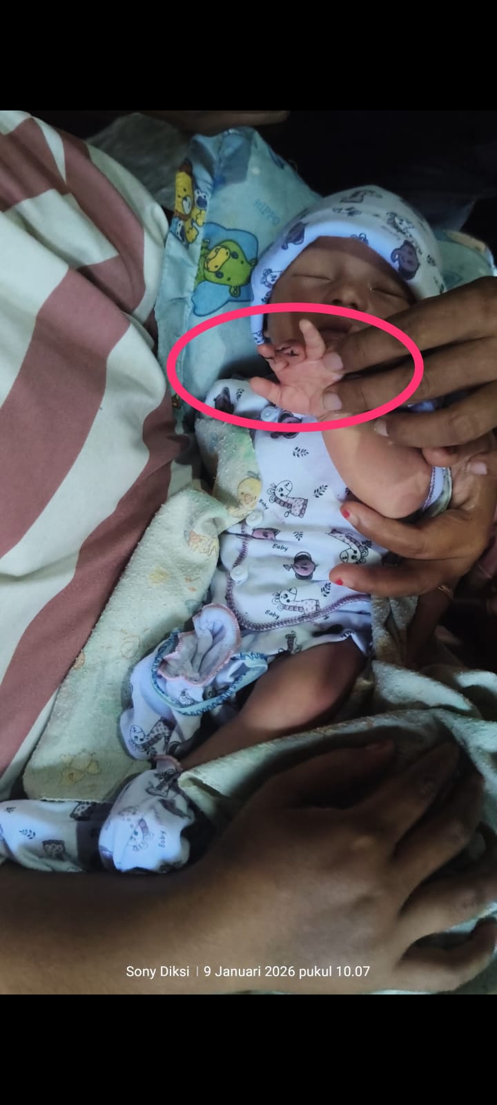 Mirisnya lagi bidan tersebut tidak mengetahuinya jika bayi saya tersebut jarinya ter gunting saat hendak membantu penanganan pasca persalinan, karna Saat di cari potongan jari bayi saya tersebut Ternyata ditemukan di tempat sampah medis kemudian potongan jari tersebut saya bawa pulang. Ujarnya.