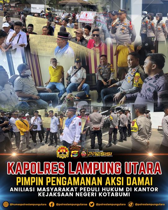 Kepala Kepolisian Resor (Kapolres) Lampung Utara memimpin secara langsung pengamanan aksi damai Aliasian Masyarakat Peduli Hukum di Kejaksaan Negeri Kotabumi, Kamis (26/10/23).