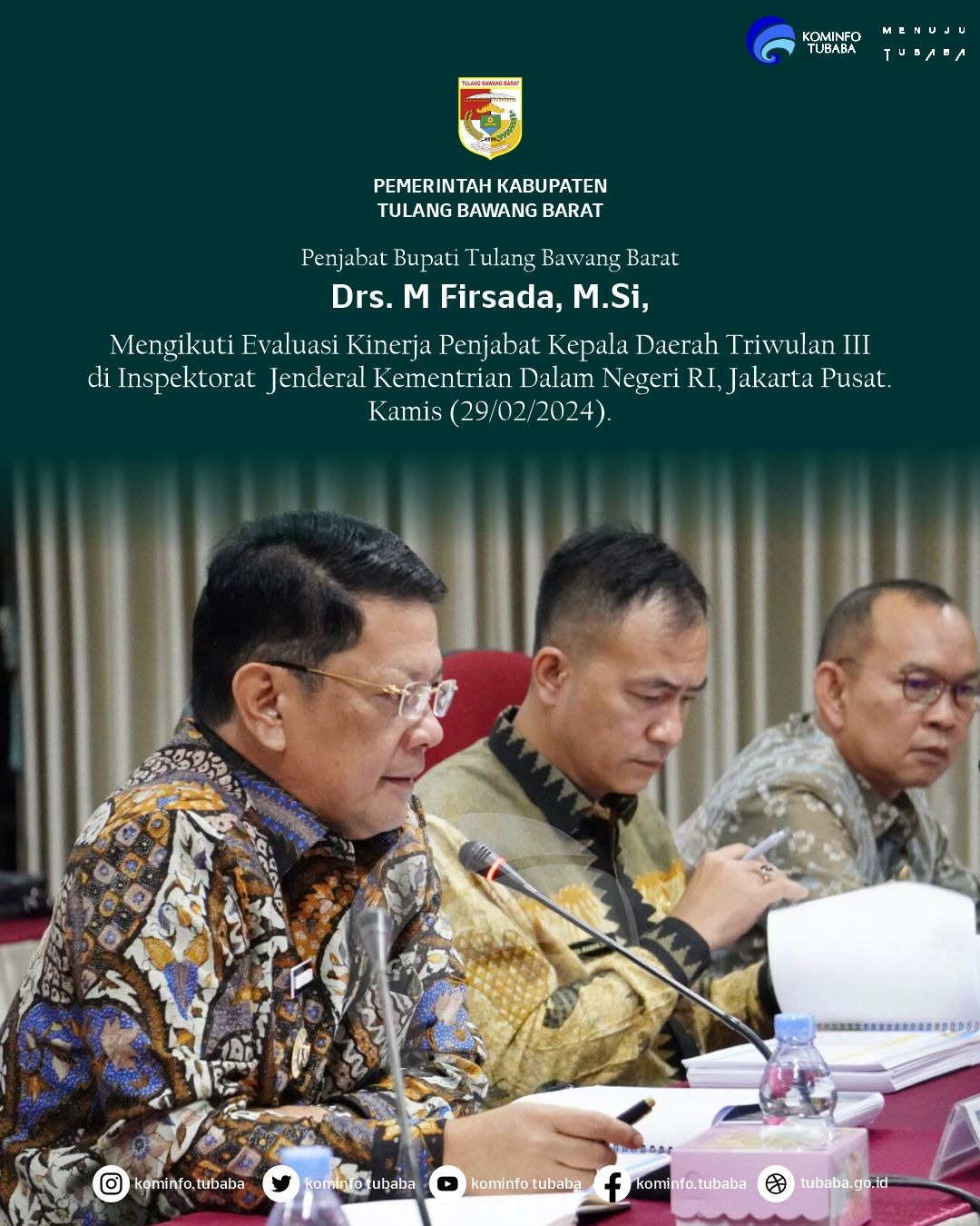 M. Firsada yang didampingi oleh jajaran Pejabat Pimpinan Tinggi Pratama di lingkup Pemkab Tubaba, menyampaikan terimakasih atas dukungan para seluruh stakeholder atas hasil evaluasi dari Kemendagri ini.