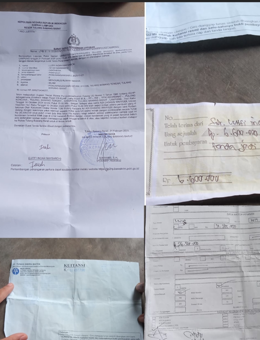 Setelah melakukan pembayar dan mendapat SPK motor yang di janjikan tidak kunjung datang sehingga berujung pada di buatkannya Laporan Polisi dengan nomor LP/B/52/II/2025/Polres Tulang Bawang Barat/POLDA Lampung.