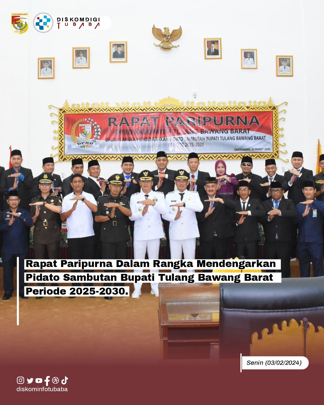 Tulang Bawang Barat, (HD) – Bupati Tulangbawang Barat (Tubaba) Ir. Novriwan Jaya, perkenalkan visi kepemimpinannya saat memberikan pidato perdana dalam rapat Paripurna DPRD yang digelar di Ruang Sidang Paripurna DPRD Tubaba. Senin (03/03/2025).