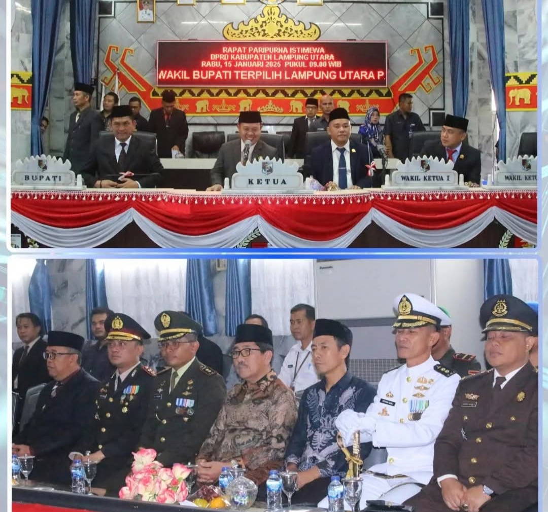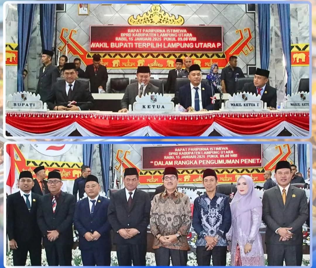Lampung Utara, (HD) – Dewan Perwakilan Rakyat Daerah (DPRD) Kabupaten Lampung Utara menggelar Rapat Paripurna Istimewa untuk mengumumkan penetapan pasangan Dr. Ir. H. Hamartoni Ahadis, M.Si, dan Romli, S.Kom, M.H, sebagai Bupati dan Wakil Bupati Lampung Utara terpilih hasil Pemilihan Serentak 2024. Rapat berlangsung di ruang sidang utama DPRD Lampung Utara pada Rabu, 15 Januari 2025, pukul 09.00 WIB.