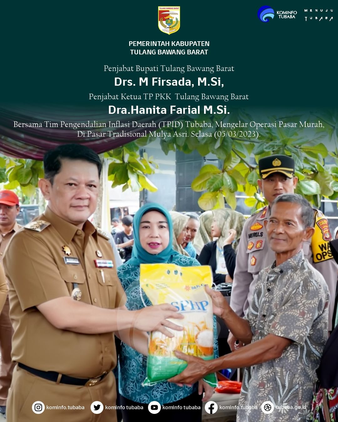Dalam kegiatan meninjau operasi pasar murah, Penjabat Bupati Tubaba, Drs. M. Firsada, M.Si., Bersama, Tim Pengendali Inflasi Daerah (TPID) Tubaba, dan didampingi Ketua TP-PKK Kabupaten Tubaba, Dra. Hanita Farial Firsada, M.Si.