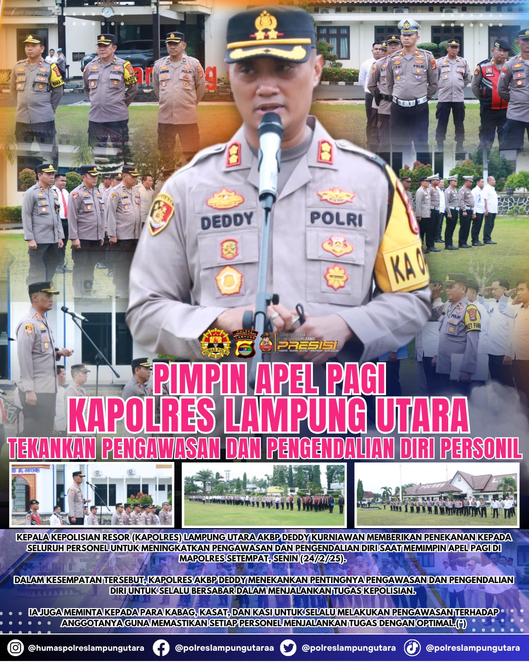 Lampung Utara, (HD) – Kepala Kepolisian Resor (Kapolres) Lampung Utara AKBP Deddy Kurniawan memberikan penekanan kepada seluruh personel untuk meningkatkan pengawasan dan pengendalian diri saat memimpin apel pagi di Mapolres setempat, Senin (24/2/2025).