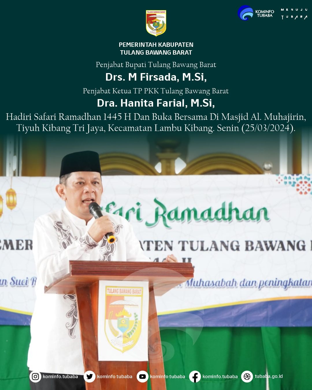 Tulang Bawang Barat, HD – Melalui kunjungan Safari Ramadhan 1445 Hijriah, Penjabat (Pj) Bupati Tulangbawang Barat (Tubaba) Drs. M. Firsada, M.Si. melakukan buka puasa bersama dengan masyarakat di Halaman Masjid Al Muhajirin Tiyuh/Desa Kibang Tri Jaya, Kecamatan Lambu Kibang. Senin (25/03/2024).