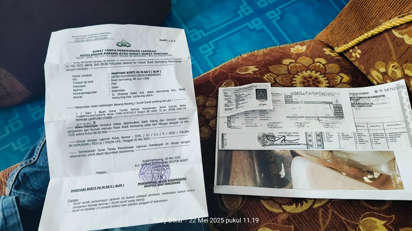 Lampung Utara, (HD) -Maryani Seorang warga bukit kemuning kabupaten Lampung Utara melaporkan kehilangan Surat Tanda Nomor Kendaraan (STNK) di wilayah polres Lampung Utara, (22/5/2025)