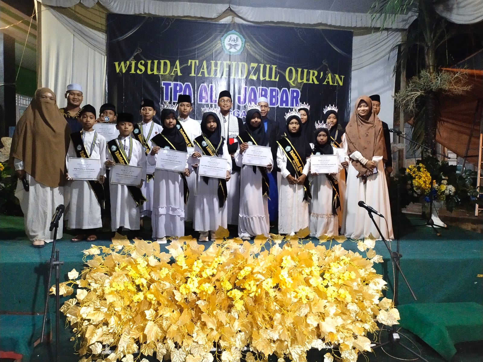 Penyerahan piagam Kepada para Wisudawan wisudawati sebanyak 13 orang oleh Pendiri TPA sekligus ketua pengurus Masjid Al-Jabar Suherni M. Hasan dan diteruskan oleh majelis masjid Ir. Sapuan serta pemuka masyarakat setempat, yang sebelumnya prosesi wisuda Tahfiz ditandai pengalungan mendali sebagai simbol penghargaan kepada para santriwan-santriwati hafiz qur’an juz 30 oleh Ustadz Fredo Saputra.